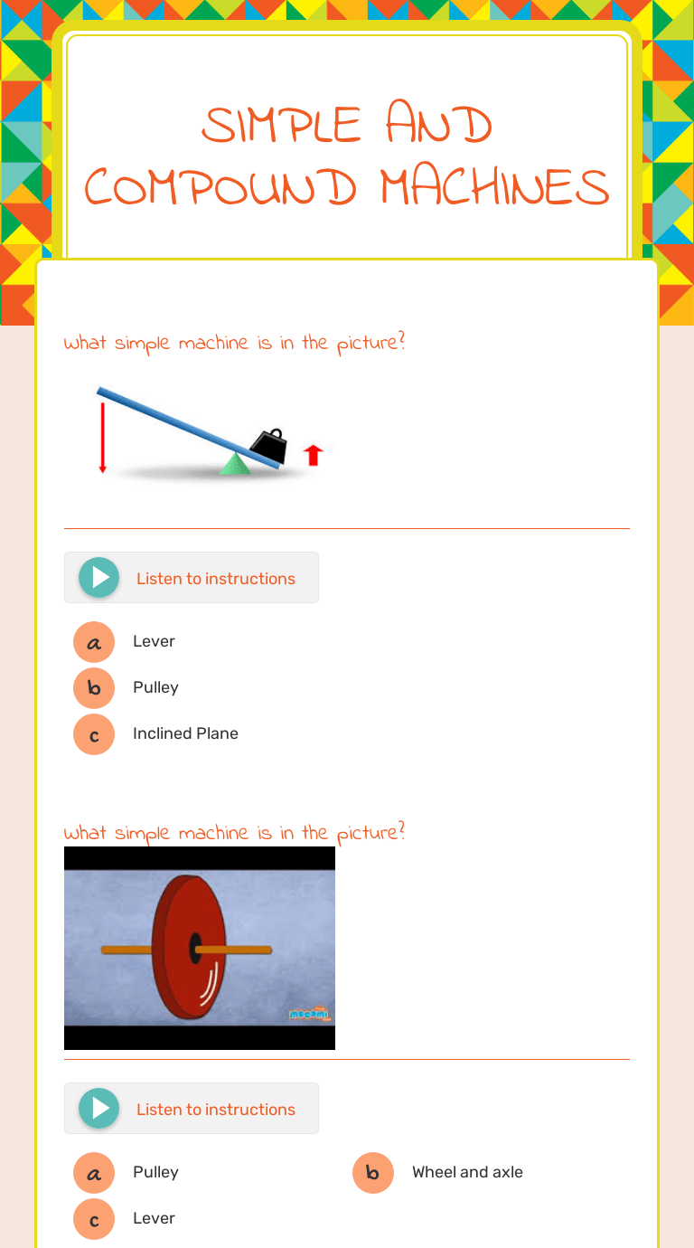 • doing work requires effort. Print answers · compound machines. The pulley, screw, wheel and axle, wedge, lever, and the inclined plane. Student worksheets ask questions about the machine being investigated and present challenges that can be used to help students think more deeply . The fewer simple machines a compound machine contains, the greater its mechanical advantage.